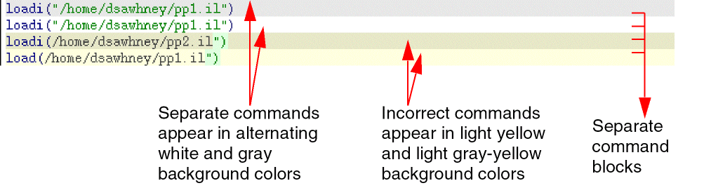 To execute a command block, press Enter. When a command is executed, the complete command block is sent to the SKILL parser for further syntax checking.