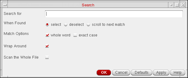 - If the specified search string can be found in the text window, the located string is highlighted. Each time you click Apply, the next occurrence of the specified string in highlighted until either the end of the text file is reached (if you selected no for Wrap Search) or you click OK (the next step).