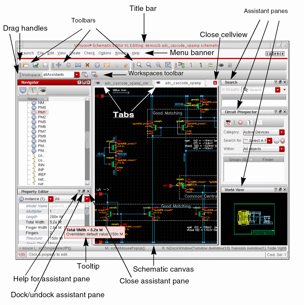 You can specify only those user interface components that are available for a particular viewtype or application as part of your workspace. For example, you cannot create a workspace in the Virtuoso Layout XL that contains an assistant pane that is specific to the ADE Explorer environment.