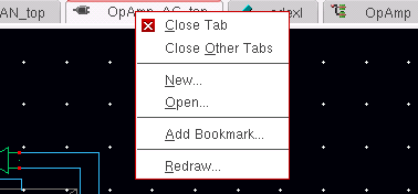 You can have one or more cellviews open on one or more tabs in a session window. For example, you might have three tabs on which you have the schematic and symbol views of your NAND2 cell and the layout view of your AMPLIFIER cell open in the same session window. You select which cellview appears in the foreground of your session window by clicking on the corresponding tab header.