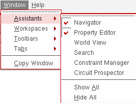 A menu of those assistant panes and toolbars available to the current application/view type appears. Active items appear with a check mark to the left of their names.