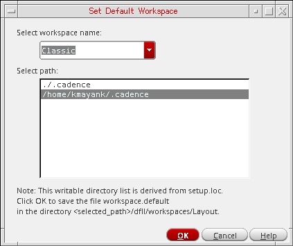 All writable locations in your CSF (Cadence Search File) gets listed. - Click the OK button to set the new default workspace for the current application.